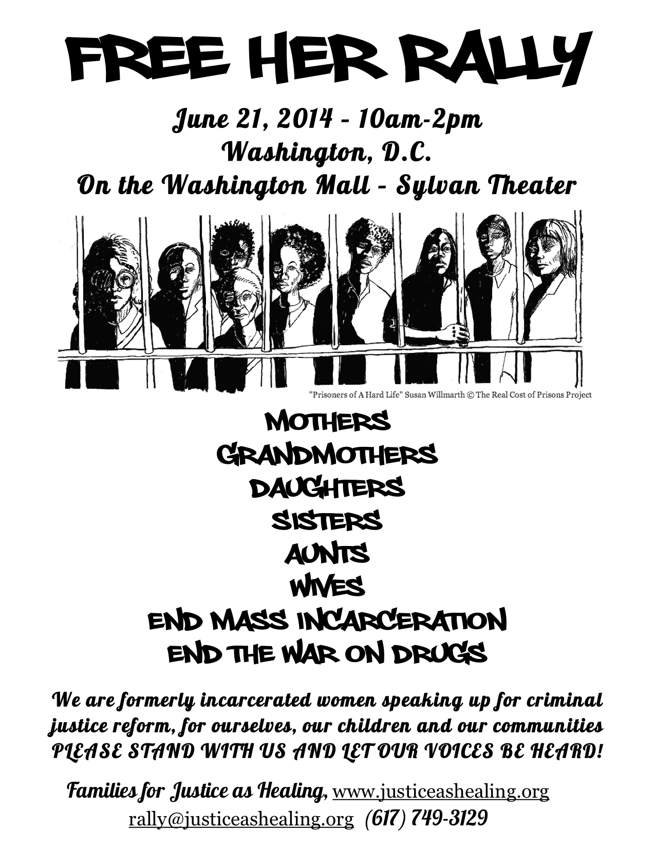 Boston, MA (PRWEB) June 04, 2014 -- Families for Justice as Healing is mobilizing concerned individuals and organizations from across the country to converge on the National Mall in Washington, D.C. in support of an end to mass incarceration. The FREE HER Rally will assemble at the Sylvan Theater on the National Mall, Independence Avenue & 15th, on Saturday, June 21, 2014 from 10:00 am-2:00 pm.