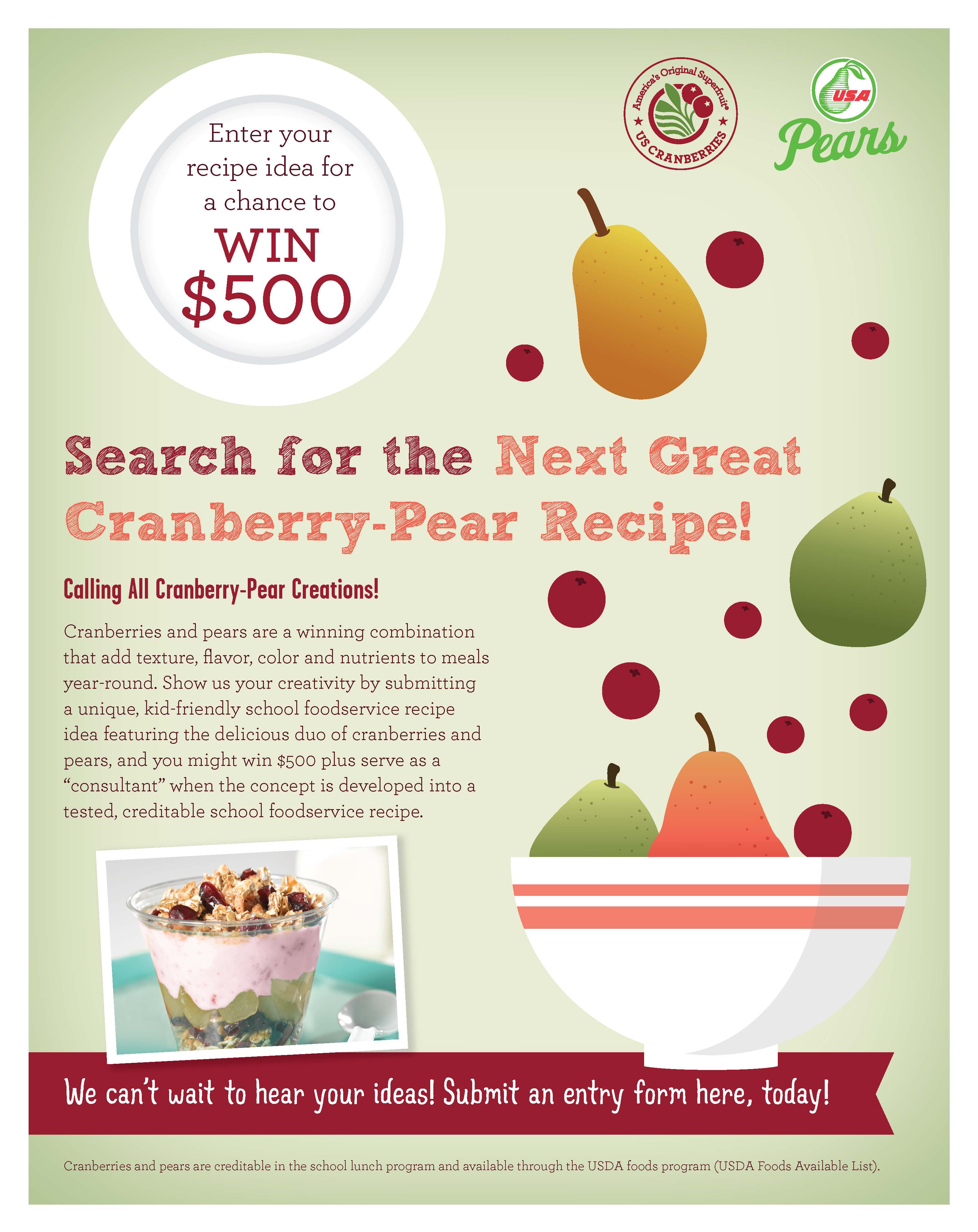 “We were excited to partner with the Cranberry Marketing Committee since the sweetness of pears and tart flavor of cranberries complement each other beautifully in recipes! In addition, with both fruits on the USDA’s Foods Available List, they are easily accessible by foodservice professionals looking for creative and refreshing ways to incorporate fruit in their school menus,” said Kathy Stephenson, marketing communications director of the Pear Bureau Northwest.