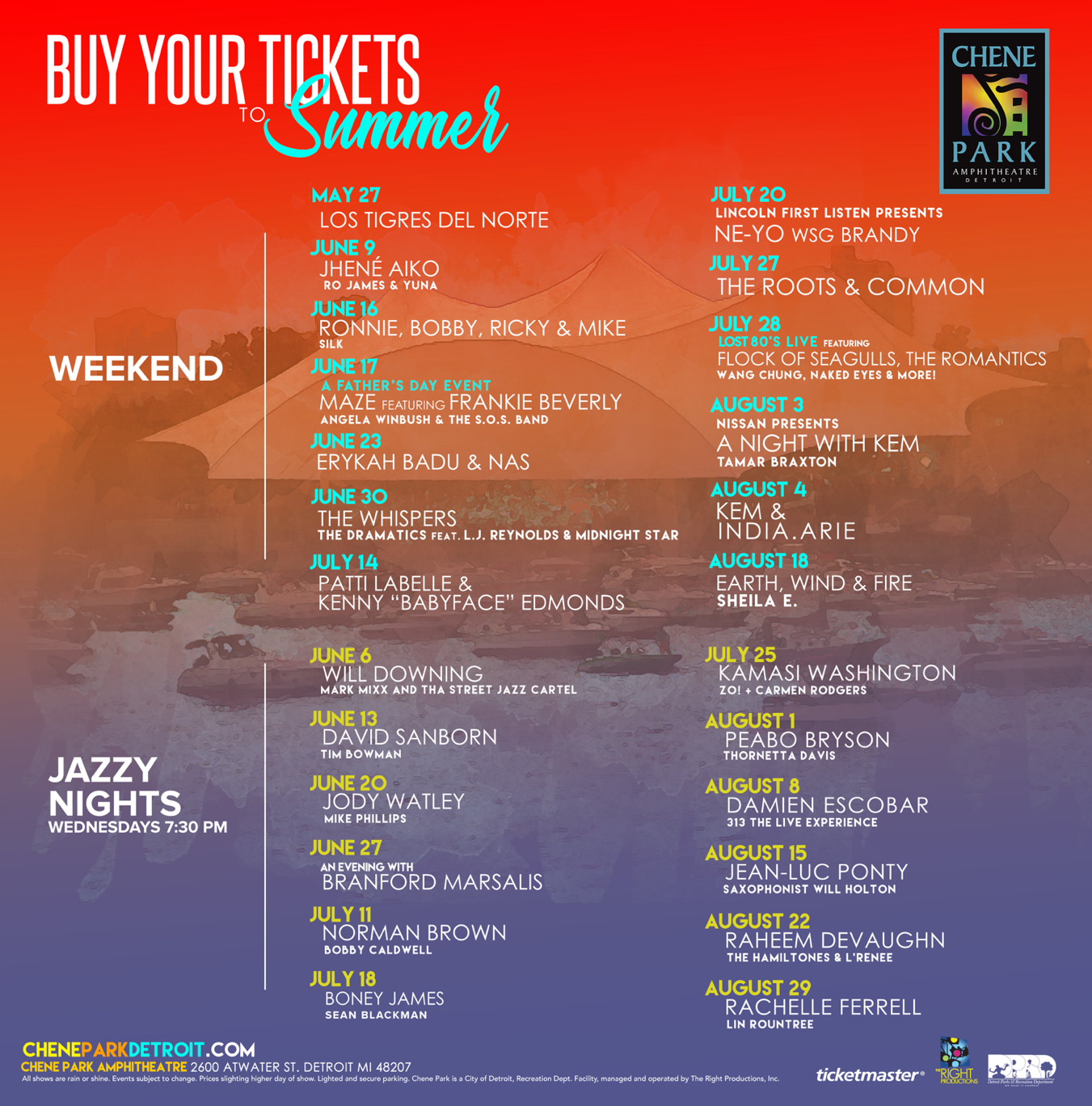 *Includes $4 facility fee. All shows are rain or shine. Events subject to change. Prices slightly higher day of show. Lighted and secure parking. Chene Park is a City of Detroit, Recreation Dept. facility, managed and operated by The Right Productions, Inc.