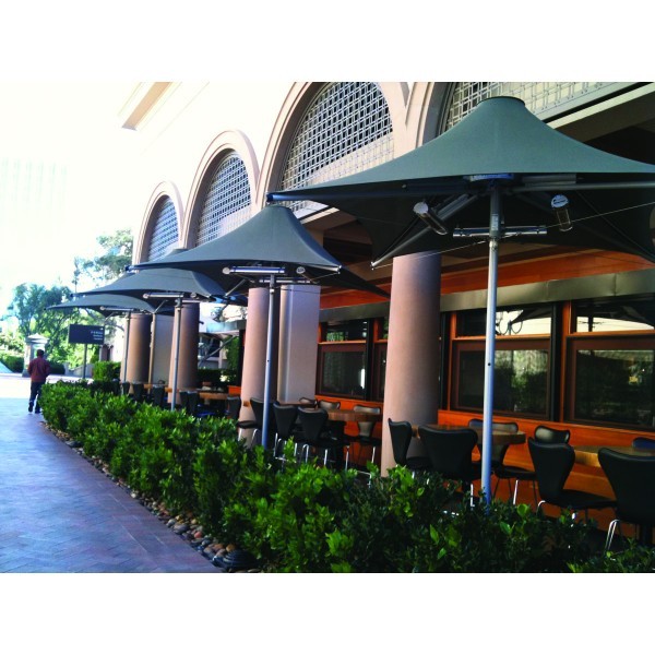 If floor space is an issue and the Tower Heaters don't seem like a workable solution, a space-efficient and elegant solution to cold-weather woes is the line of heated shade structures that are found at Contract Furniture Company. These tropical grade steel-frame umbrellas have integrated electric radiant heat (ERH) panels and lighting. Not only do they block out the elements and harmful UV rays, they also serve to provide shelter and warmth to outdoor areas, which can extend operating hours and help to eliminate seasonal downturns due to bad weather.