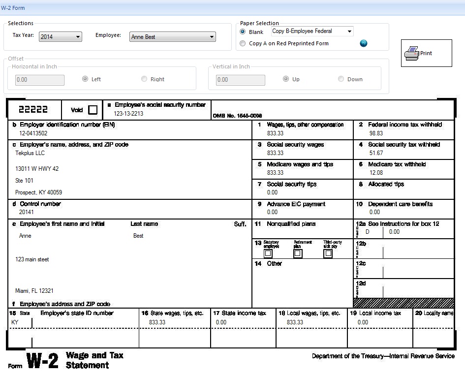 - Prints tax forms 941, 940, W2 and W3 (Please note: Copy A required for W2 and W3 printing)