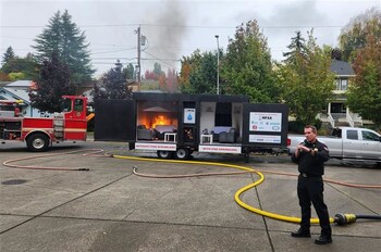 Families can see the power of fire and fire sprinklers by watching a side-by-side burn demonstration, where two decorated "living rooms" are set on fire at the same time: one with fire sprinklers and one without.