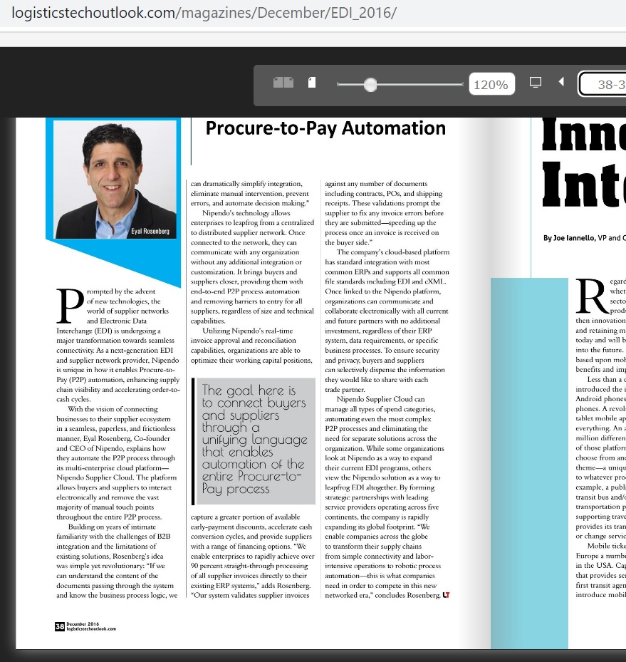 Companies using the Nipendo Supplier Cloud have demonstrated success that far exceeds industry standards. “By electronically receiving and processing over 90% of our supplier invoices, IAI is putting to practice the idea of the paperless organization,” said Gabi Ben-Shlush, Head of Accounting at Israel Aerospace Industries (IAI).