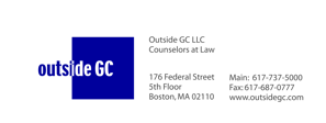 Outside GC provides senior in-house legal counsel on an on-demand basis to emerging and large companies alike, at highly competitive rates. With clients in the US and Europe across a broad range of industries, the company’s offerings include negotiating and drafting customer, vendor and distribution agreements; debt and equity financing transactions; employee matters; immigration services; pre-litigation dispute resolution; intellectual property protection; and mergers and acquisitions. Together with its sister company, Patent GC LLC, which provides on-demand patent and trademark legal services, the firm has over 45 senior business attorneys in Massachusetts, Connecticut, New York, Washington D.C, and Colorado. For more information, please visit http://www.outsidegc.com, http://www.linkedin.com/company/outside-gc-llc, or call (617) 737-5000.