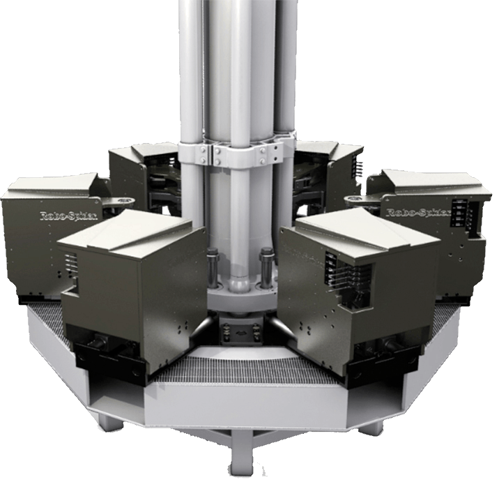 Unlike manual riser tools that operate on a single bolt at a time, the Robo-Spider is designed to apply precise amounts of torque to each riser flange bolt simultaneously, simplifying and accelerating the make-up or assembly of riser sections, and reducing the risk of injury to crew members from heavy manual torque wrenches. During disassembly or break-out of riser sections, the Robo-Spider loosens the riser flange bolts just as quickly, reducing rig down-time and operating costs.